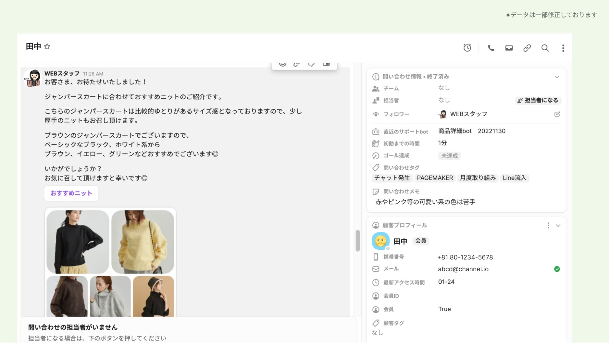 お得意さんを作っていくには、お客さまを理解して対応することが重要です。チャネルトークの場合、過去の問い合わせや顧客情報が見えるので、新規のお客さまなのか、お得意さんであるのかを判別しながら接客することができます。その結果、お客さまとの継続的なコミュニケーションを実現することができました。