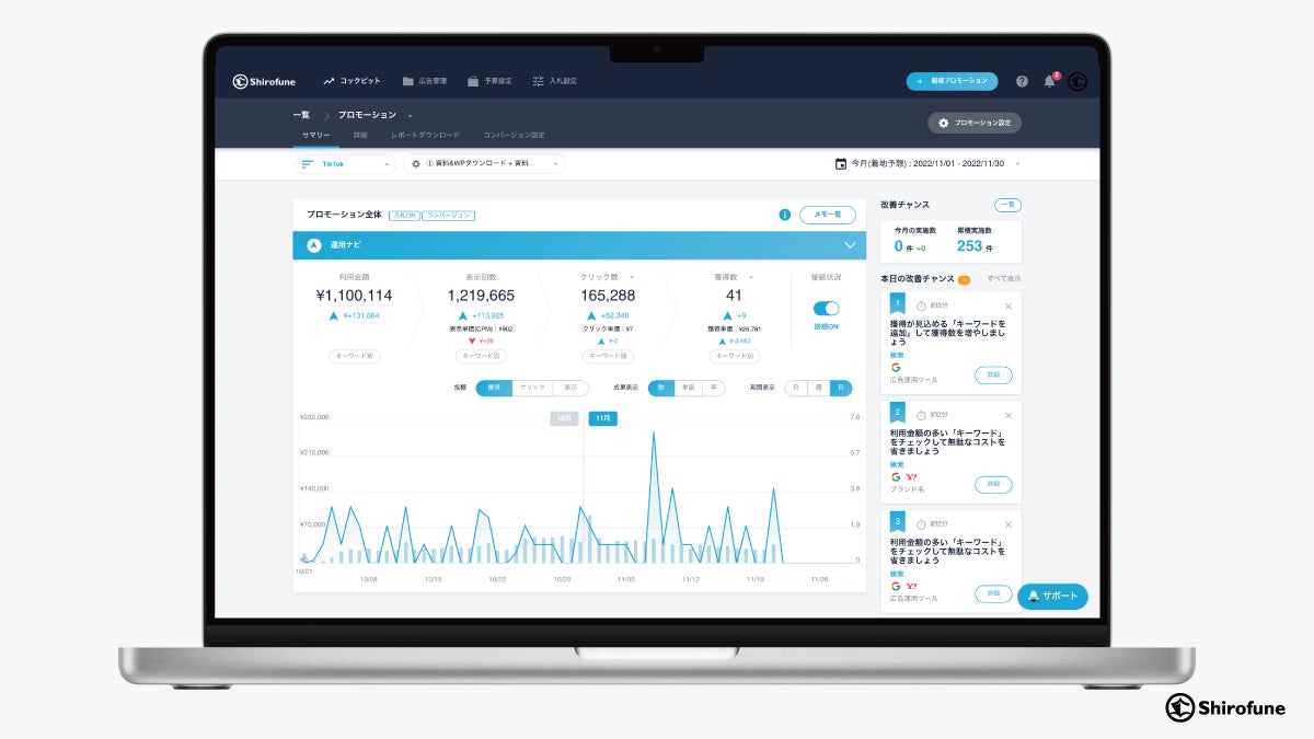 コックピット画面では前日までの成果をグラフに可視化。TikTok広告単体はもちろん、複数媒体の成果も自動でグラフに反映。また詳細な情報を含むExcelレポートもワンクリックで出力可能です。