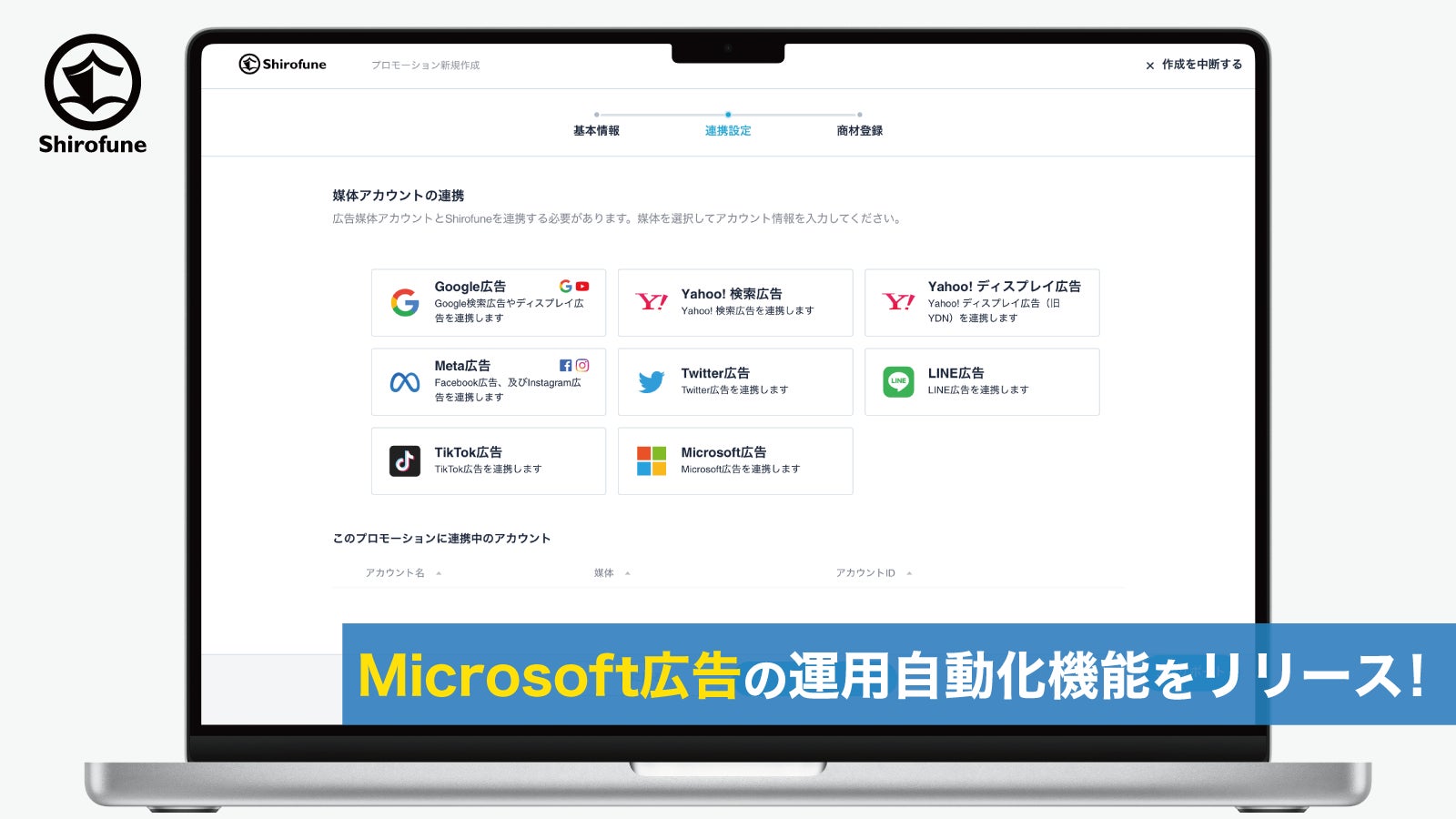 広告運用自動化ツール「Shirofune」は、Microsoft社の提供する広告サービス「Microsoft広告」対応の運用自動化機能をリリースしました。これによりMicrosoft広告の予算管理・入札最適化と成果分析、レポート作成をShirofuneで自動化できるようになりました。