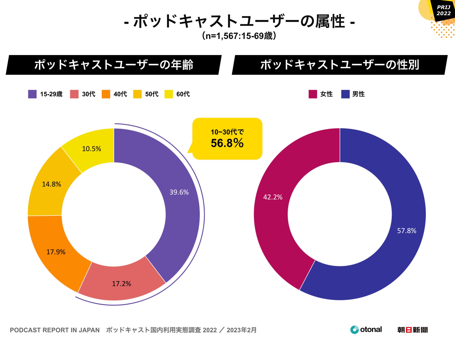 年代の比率では、ポッドキャストユーザーの過半数を39歳以下が占め、15~29歳が39.6%、15~39歳が56.8%でした。性別では女性よりも男性(57.8%)が多い結果となりました。