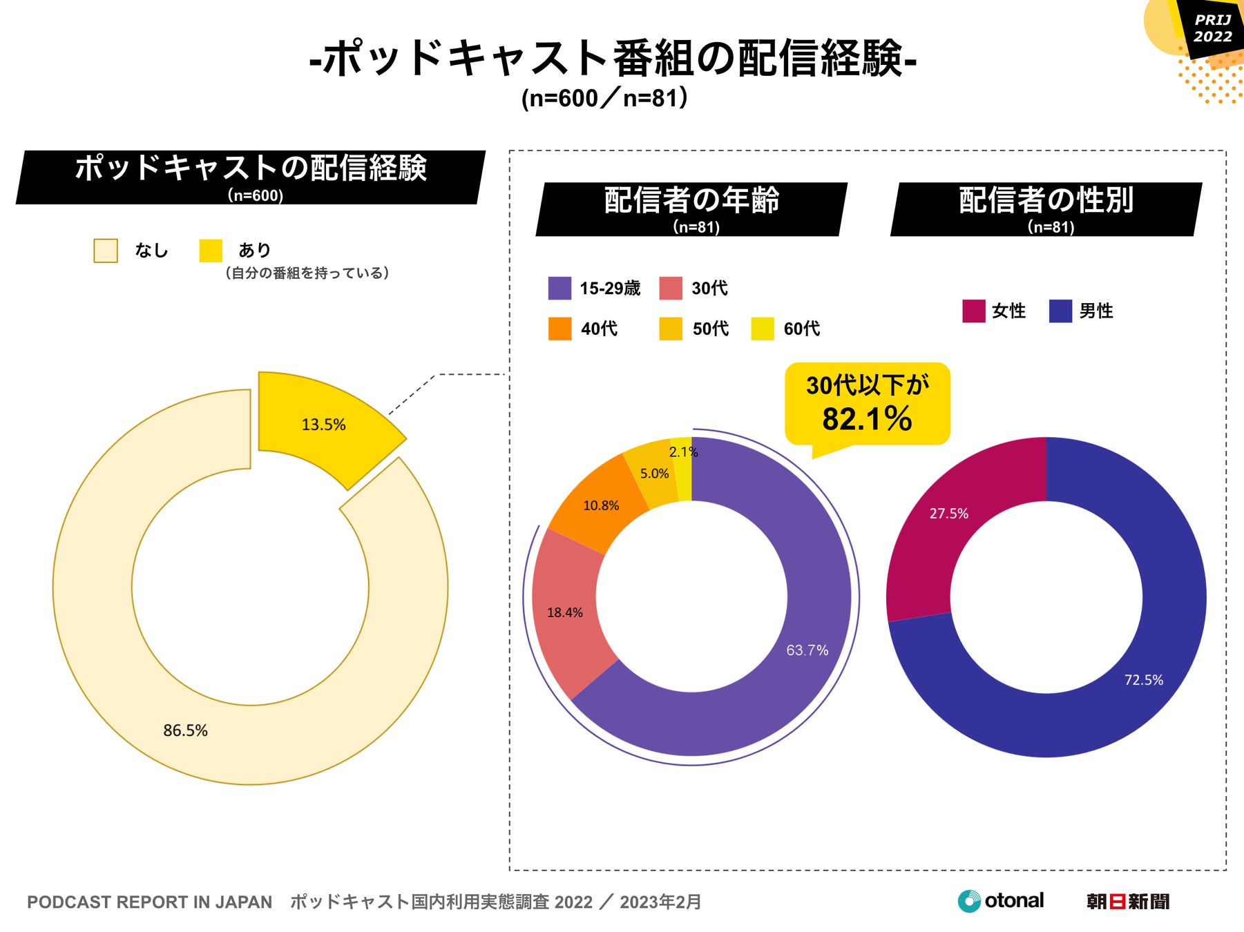 - ポッドキャスト配信経験者はユーザーの13.5%。うち8割が30代以下。特に朝ポキユーザーは、3割が番組配信経験者。