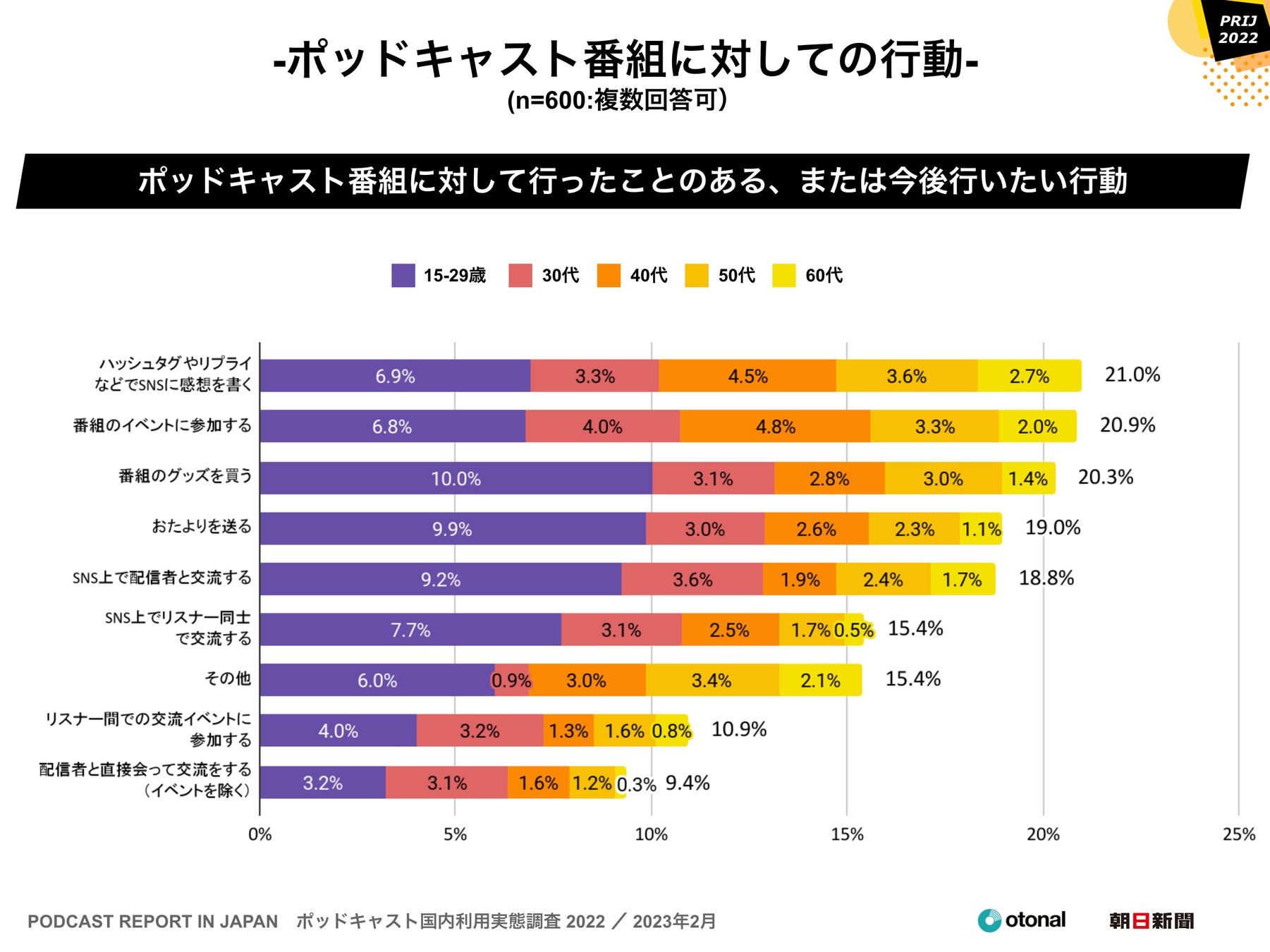 ポッドキャスト番組に対して行ったことのある、または今後行いたい行動について調査したところ、20代以下のユーザーでは、グッズの購入やおたよりなどに積極的な「推し活」のような行動の傾向がみられました。一方の30代ユーザーでは、イベントへの参加、リスナー間での交流、配信者とのSNS上 や直接対面しての交流など、距離感の近さを求めている傾向があります。