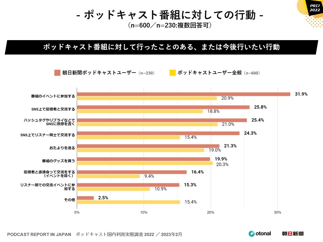 朝日新聞ポッドキャストユーザーは、ユーザー全般よりも番組へのコミットが総じて積極的です。番組イベントへの参加、SNS上やイベントでの配信者やリスナーとの交流に特に関心が高い傾向があります。
