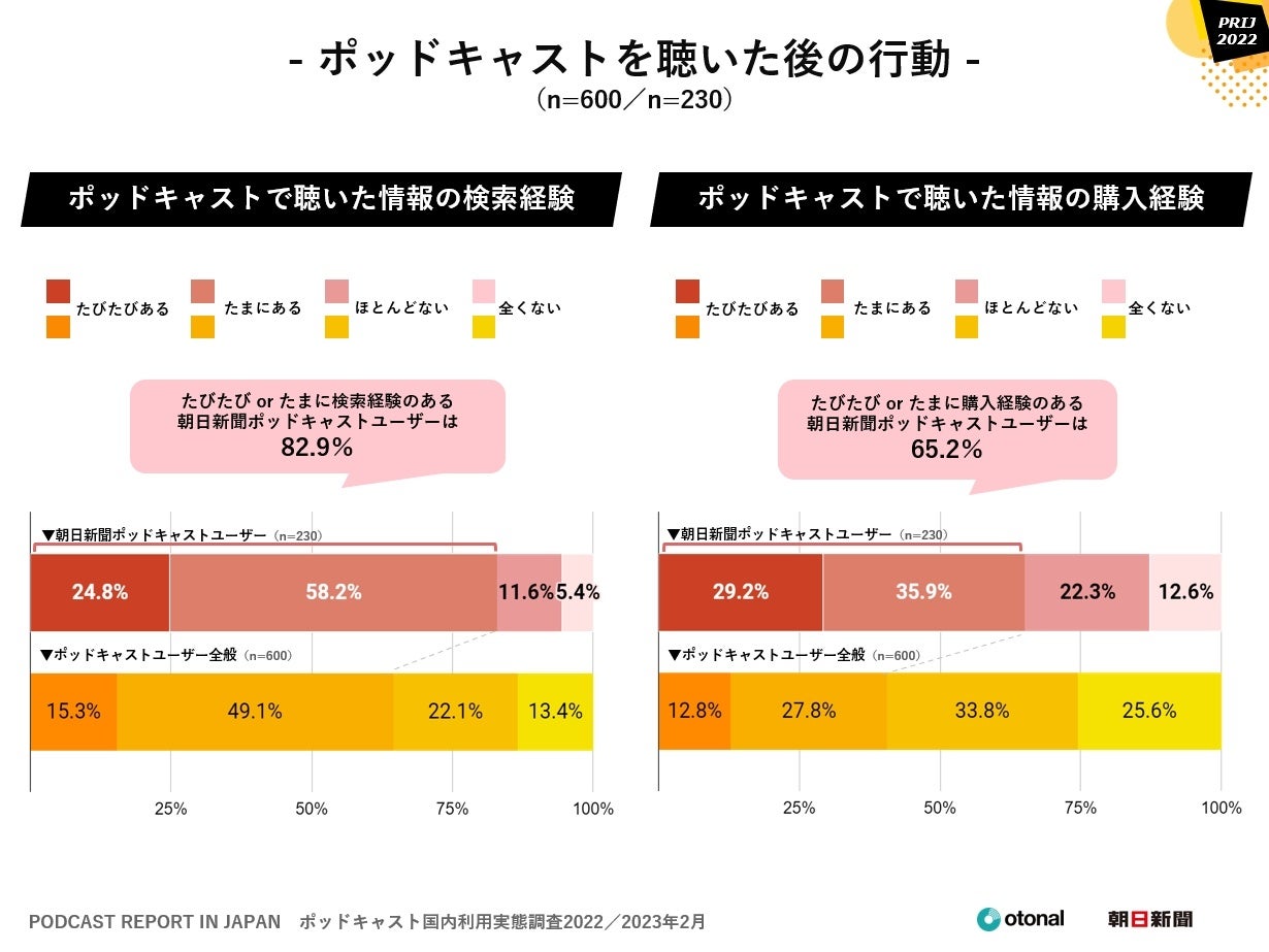 ポッドキャストで聴いた情報について、ユーザーの64.4%が一定の頻度で検索を行い、40.6%が一定の頻度で購入をしています。さらに朝日新聞ポッドキャストユーザーに限ると、82.9%が検索を行い(ユーザー全般+18.5ポイント)、65.2%が購入をしています(ユーザー全般+24.6ポイント)。ポッドキャストで得た情報に対して、積極的な行動を取るユーザー像がうかがえます。