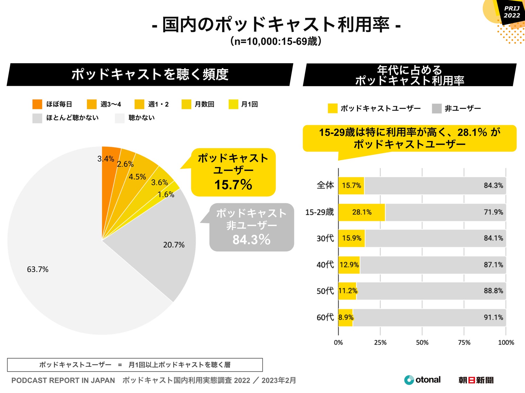 株式会社朝日新聞社(代表取締役社長:中村史郎)は2023年2月28日、昨年12月に株式会社オトナル(代表取締役:八木太亮)と共同で実施したポッドキャストの利用実態調査の概要を、「PODCAST REPORT IN JAPAN ポッドキャスト国内利用実態調査2022」として公開しました。