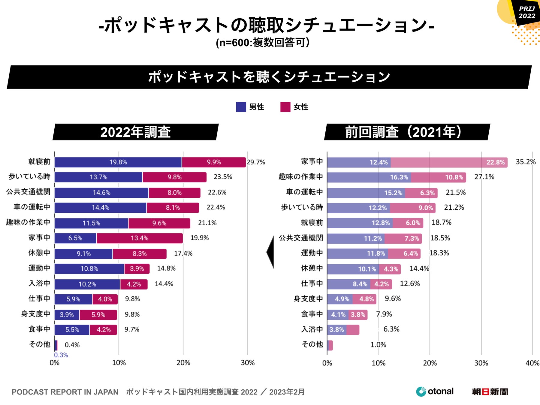 通勤やオフィス勤務を主軸としたコロナ禍以前の生活に戻りつつあることが、ポッドキャストの聴取シチュエーションにも影響していると考えられます。