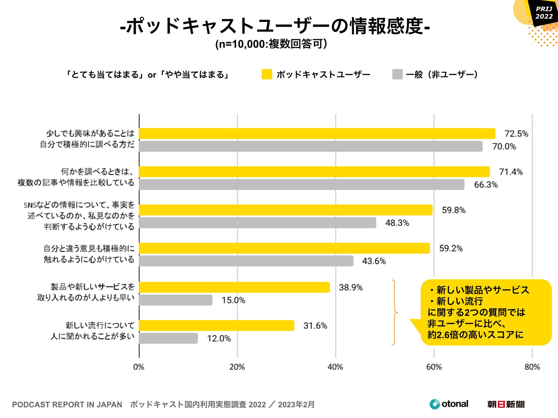 情報感度に関する質問では、前回までの調査同様に、非ユーザーに比べてポッドキャストユーザーのほうが、感度が高い結果となりました。