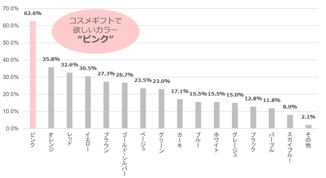 ホワイトデーのお返しギフトにコスメを欲しいと回答した10~40代へ欲しいカラーを調査した結果、全体の6割以上が「ピンク」と回答。全年代でピンクカラーのコスメを欲しい傾向があることから、春コスメの王道的なカラーで年代を問わず普遍的な人気があるカラーであることが推察されます。