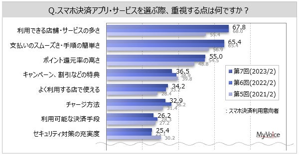 ■スマホ決済選定時の重視点は、「利用できる店舗・サービスの多さ」が利用意向者の7割弱、「支払いのスムーズさ・手順の簡単さ」が約65%、「ポイント還元率の高さ」が55%