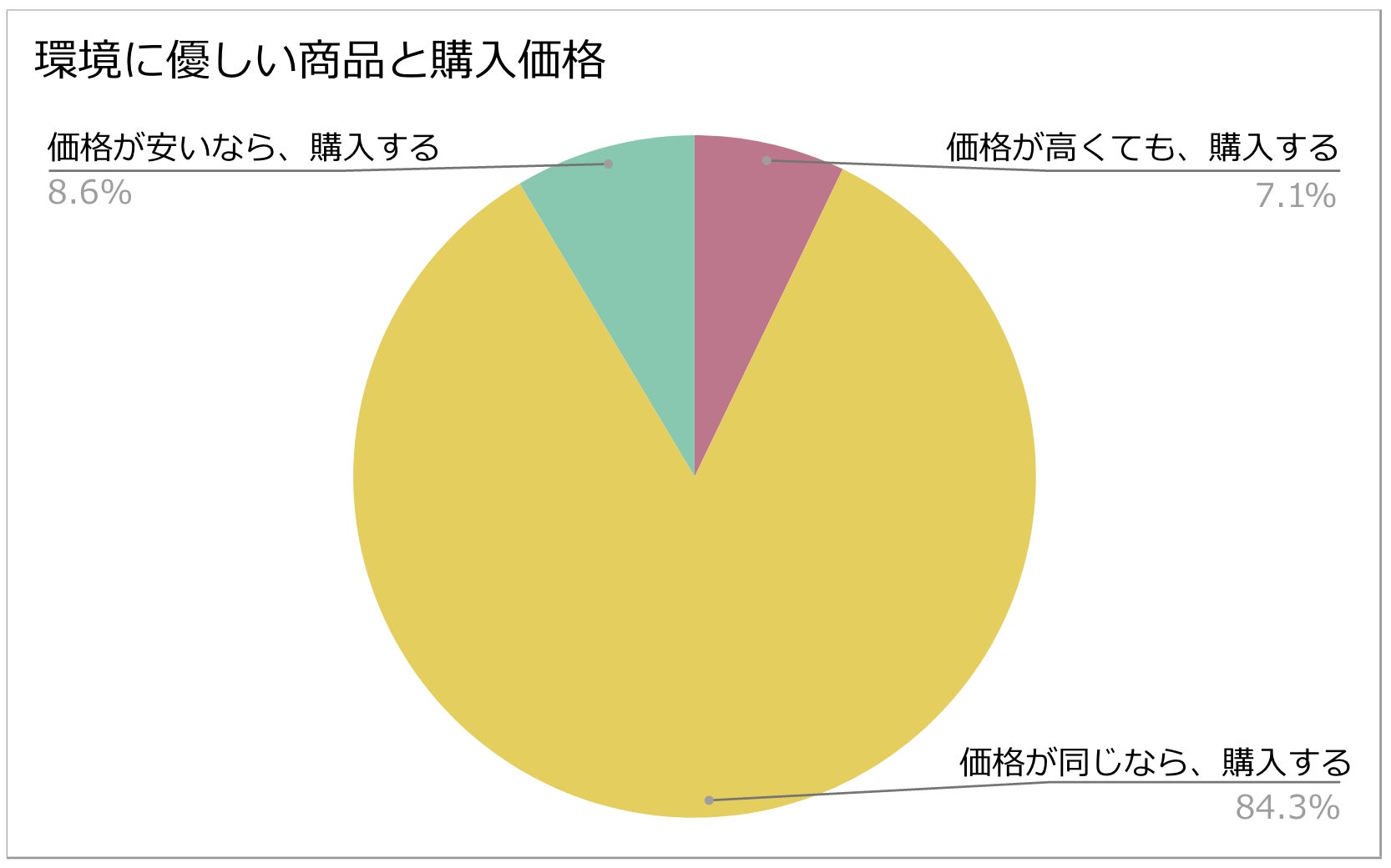 ・「場合によっては環境に優しい商品・サービスを選ぶ」と選択した方の中で、価格が高くても環境に優しい商品を選ぶと回答した方は7.1%にとどまった。また、84.3%が価格が同じなら環境に優しい商品を選ぶと回答した。