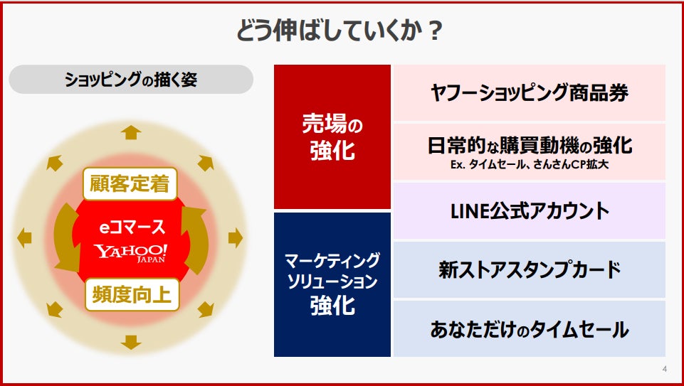 当社の強みである「LINE」と「PayPay」との連携により獲得したユーザーに対し、今後は定着・育成にも一層力を入れてまいります。日常的な購買機会の増加を引き出すような売場そのものの改善に加え、リピートに寄与するさまざまなソリューションを近く続々とリリースしていく予定ですのでご期待ください。