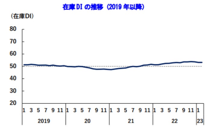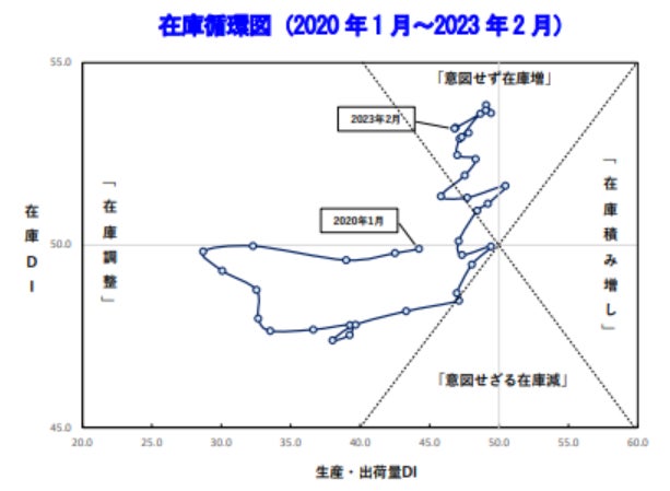 ・在庫DI、仕入単価DI、販売単価DIについて在庫(53.2)は50を上回り増加傾向が続いている。在庫循環は、現在「意図せず在庫増」局面となるもやや「在庫調整」局面に近づきつつある