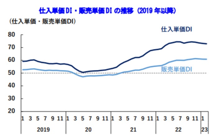・仕入単価DI(72.9)および販売単価DI(60.9)は、ピークは過ぎつつあるがそれぞれ高止まり傾向