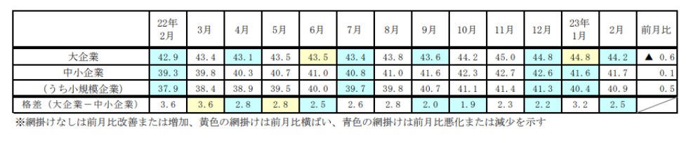 「中小企業」(41.7)…同0.1ポイント増。3カ月ぶりに改善。『農・林・水産』は「木材価格が安定」していたことなどで2カ月ぶりに改善した。一方、原材料やLNG、電気料金高騰のコスト増加に対しては、価格転嫁や生産性向上などの対応が追いつかず下押しした。