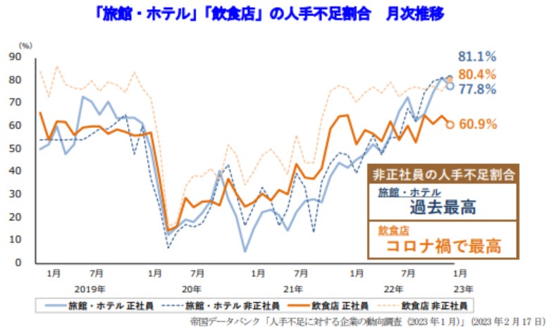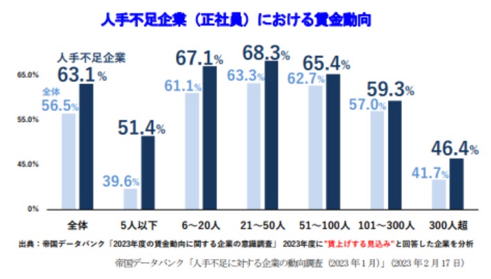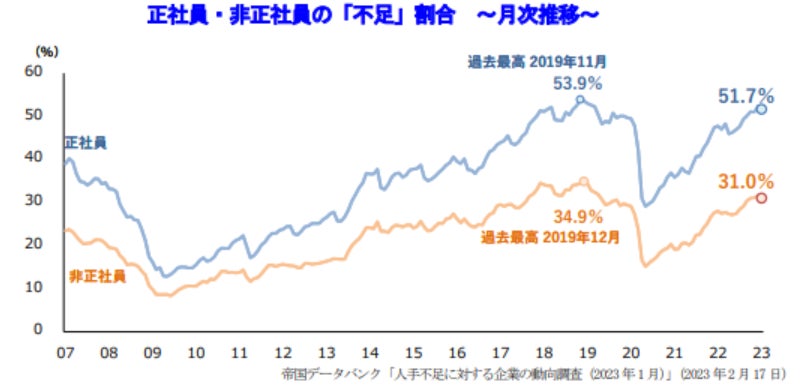 ・人手不足と賃上げ動向について従業員の人手不足割合は正社員51.7%(2023年1月)、非正社員31.0%(同)と新型コロナ流行以前の水準に