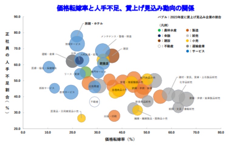 ・人手不足が激しい「旅館・ホテル」や「飲食店」では、価格転嫁率も低く、2023年の賃上げ見込み割合も低い
