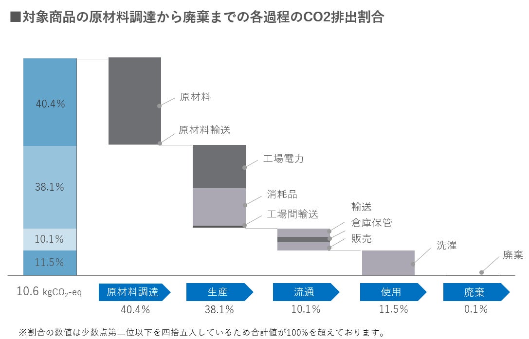当該商品の「原材料調達」「生産」「流通」「使用」「廃棄」の一連のプロセスにおける全体のCO2排出量は10.6kgでした。その中でも、「原材料調達」と「生産」の過程は特に排出量が多い(両過程とも全プロセスのうちそれぞれ約40%の排出量があり、両過程合計で全体の約80%の排出量を占めている)ことが判明しました。