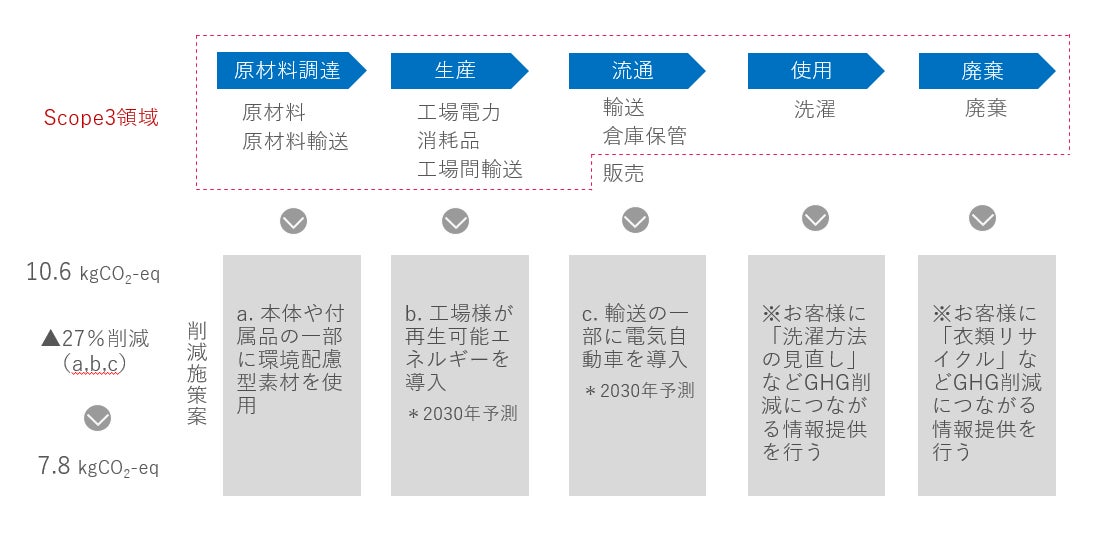 以下の削減施策を実施すれば、ライフサイクル全体のCO2排出量を10.6kgから7.8kgに削減できる(約27%の削減率)という試算結果が算出されました。今後、実現性の評価を以って、実施の検討を進めてまいります。