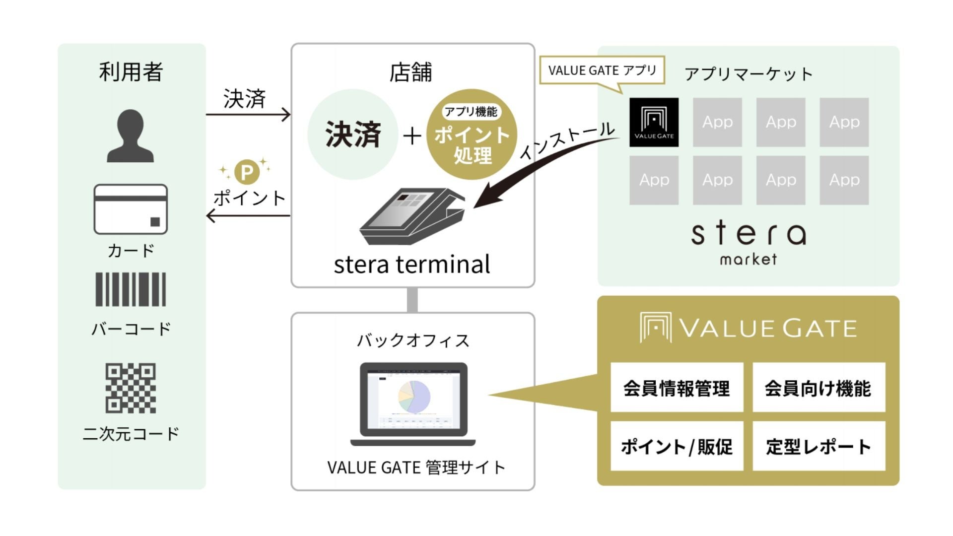 株式会社トリニティ(本社:東京都千代田区、代表取締役社長:上野 健、以下 トリニティ)が展開する、ポイント・顧客管理システム「VALUE GATE」は、三井住友カード株式会社が提供している「stera terminal(ステラターミナル)」上で利用できるアプリマーケットプレイス「stera market(ステラマーケット)」に本日よりアプリ提供を開始しましたので、お知らせいたします。「stera terminal」はクレジットカード・電子マネー・コード決済が1台で対応できる端末であり、ポイントサービスなどの販促アプリもインストールすることができます。レジ周りの省スペース化と業務効率化、販促に活用できます。