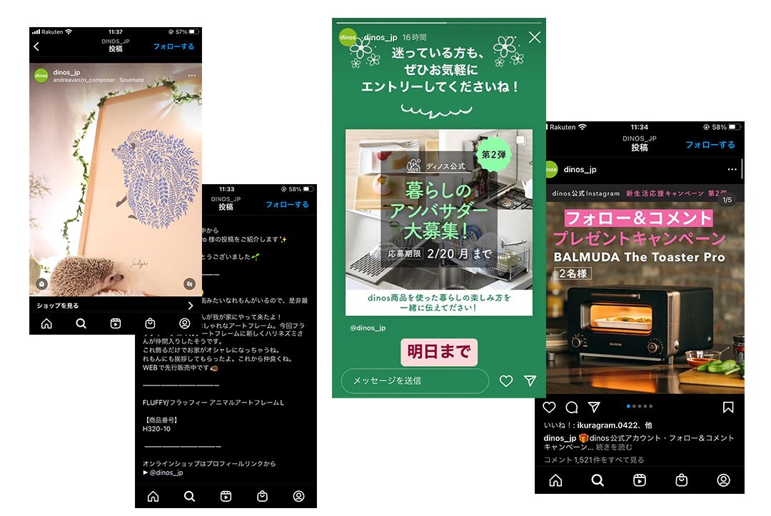 約6万人のフォロワーを抱えるインスタグラムのディノス総合アカウントでは、暮らしのアンバサダー募集やフォロー&コメントキャンペーン、タイアップ投稿紹介なども盛んに行われ、ECのみの取り組みに留まらず、SNS側でも投稿を促進するような仕掛けを進めています。
