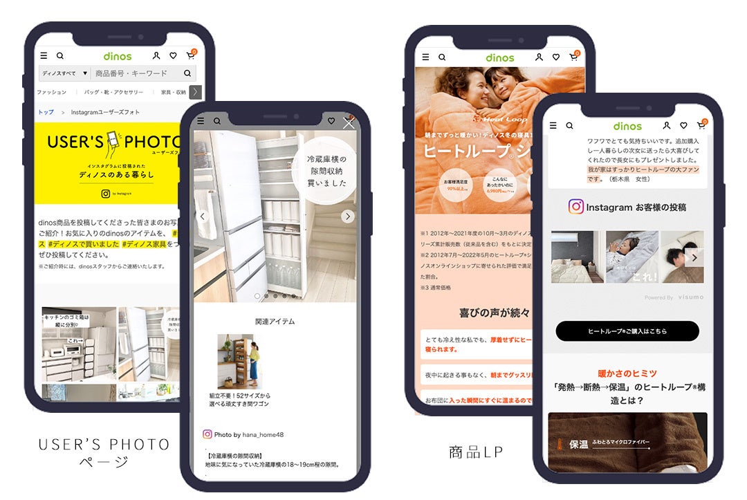 カタログ通販としても人気を博し、2000年から自社EC「ディノスオンラインショップ」を展開したディノス。紙媒体でも多大な影響力を持つ同ブランドですが、ECならではの取り組みも推進されています。今回ディノスオンラインショップでは、“USER’S PHOTO ”として、インスタグラム上のディノス商品が含まれる投稿(#ディノスだけでも約1.4万件)をvisumo socialで収集/ピックアップし、掲載。公式SNSだけでなく、ECでも“ディノスのある暮らし”の発信をスタートしました。リアルタイム性の高いコンテンツや様々なシーンが想起されるコンテンツなど幅広いラインアップで、ユーザーへの興味を喚起し、購入へつなげていただくコンテンツとして活用いただいています。