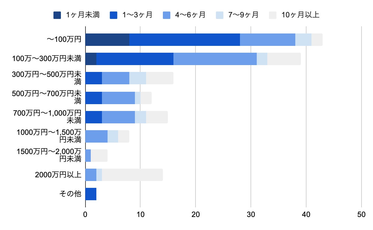 予算別に統計を取ると、アプリ開発に「2,000万円以上かかった」と答えた14名のうち、11名が「開発期間は10ヶ月以上」と答えました。一方で、「〜100万円」と答えた44名のうち20名が「開発期間は1〜3ヶ月」と回答しています。