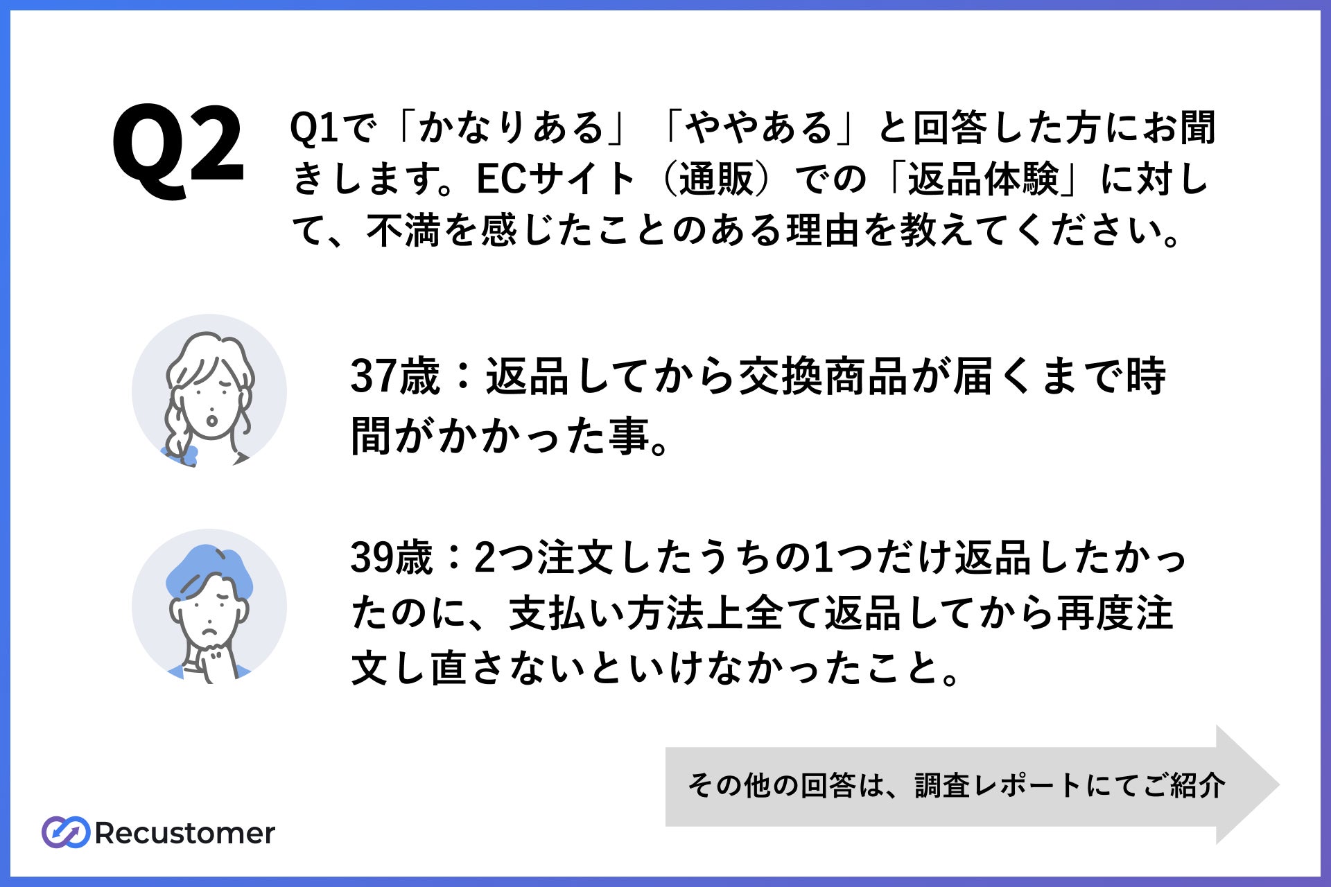 現状の返品体験への不満は、返品手続きの複雑性や、時間がかかることが要因になっていることが分かります。その他の返品に関して不満を感じる詳細な理由は、調査レポート資料にてご紹介しております。