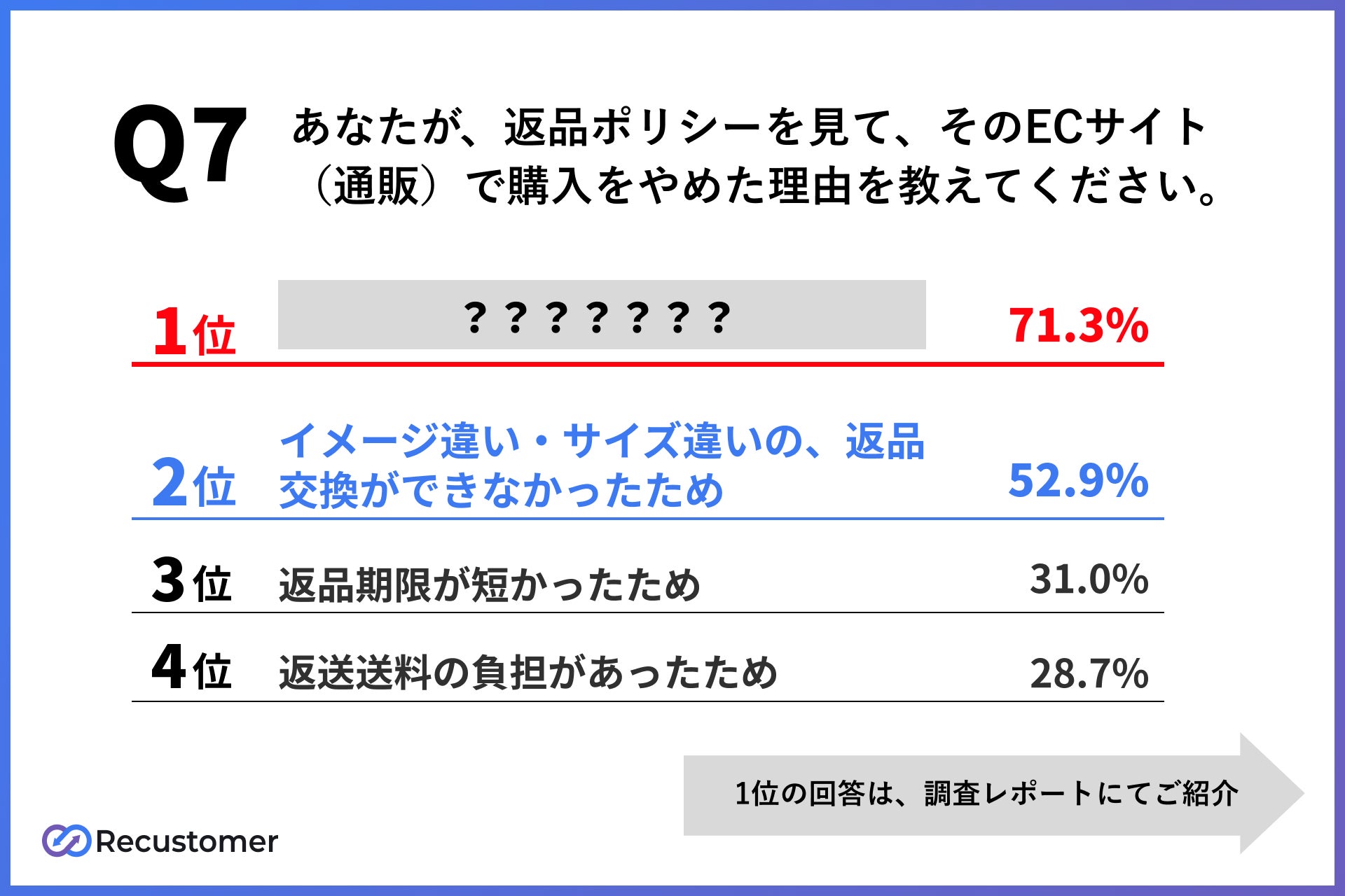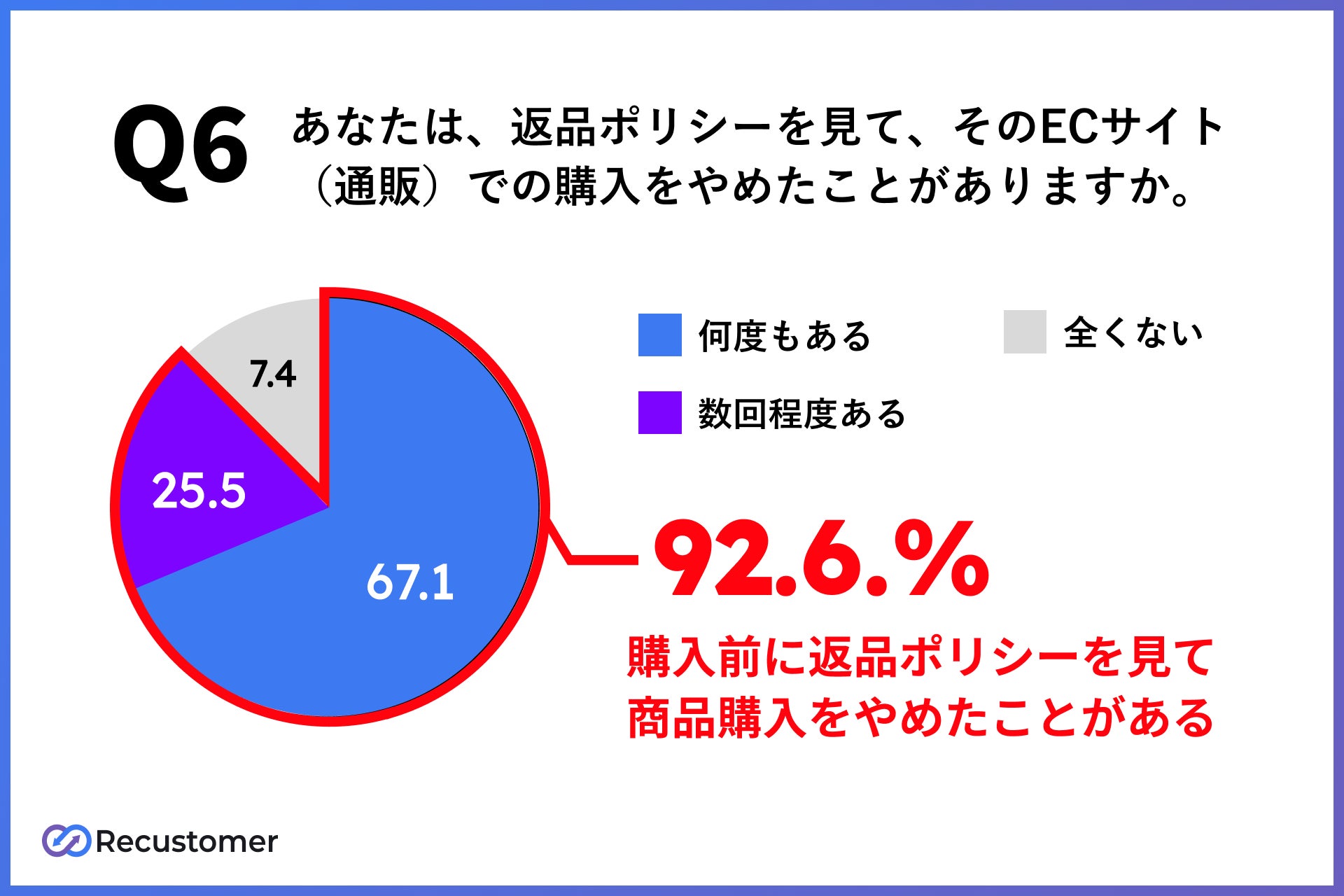 消費者の92.6%は、購入前に返品ポリシーを見て商品購入を辞めた経験のある結果となりました。この結果から、ECサイトの購入率と返品ポリシーの内容は関係性があることがわかります。