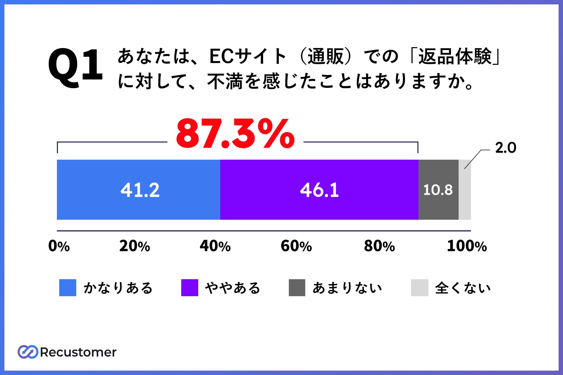 「Q1.あなたは、ECサイトでの「返品体験」に対して、不満を感じたことはありますか。」(n=102)と質問したところ、「かなりある」が41.2%、「ややある」が46.1%という回答となりました。