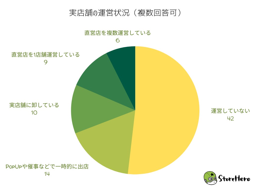 続いては、実店舗の運営状況です。70名中28名が実店舗も活用され(42名は運営していない)、PopUpや卸売などを中心に運営されているようでした。