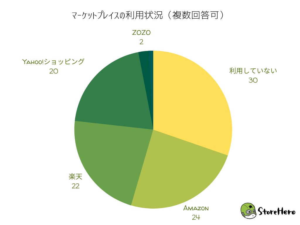 Amazon、楽天などのマーケットプレイスの利用状況です(Shopify利用者に限らない)。半数以上の方がマーケットプレイスを活用されています。