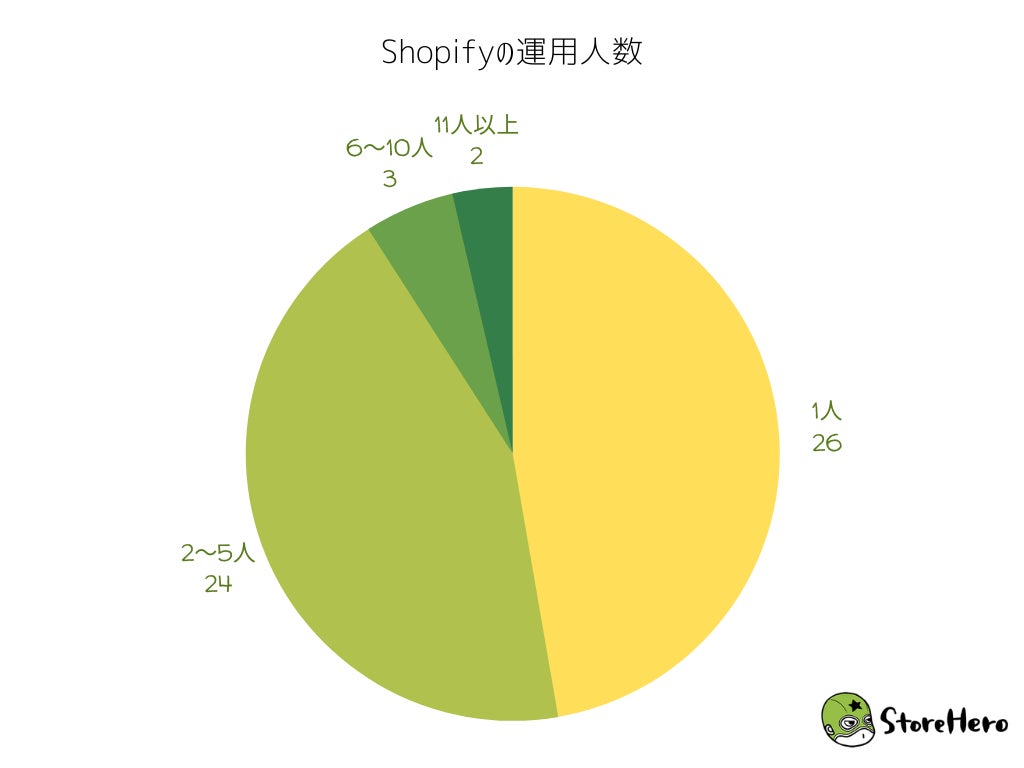 Shopify利用者の運営人数は半数近くが1名で、2〜5名と合わせると80%を超えました。多くが少人数で運営されていることが伺えました。