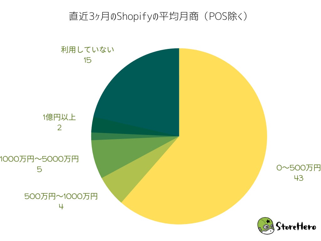 以下は直近3ヶ月のShopifyでの平均月商です。今回のアンケートに回答いただいたShopify利用者の15%ほどが月商1000万円以上でした。