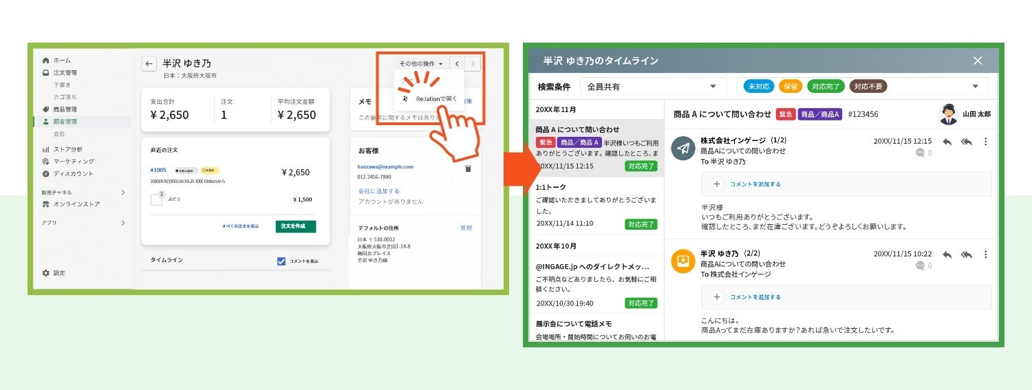 ③『Shopify』からワンクリックで『Re:lation』でのお客さまとのやり取りを表示