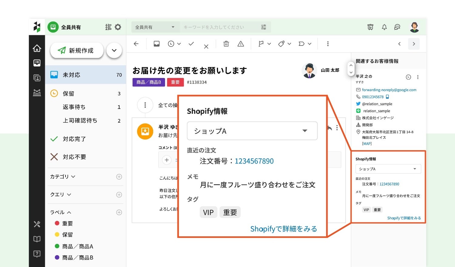 『Re:lation』上の「お客さま情報」に『Shopify』の情報が表示されます。『Re:lation』の画面から離れることなく、『Shopify』上にあるお客さま情報を確認することができます。