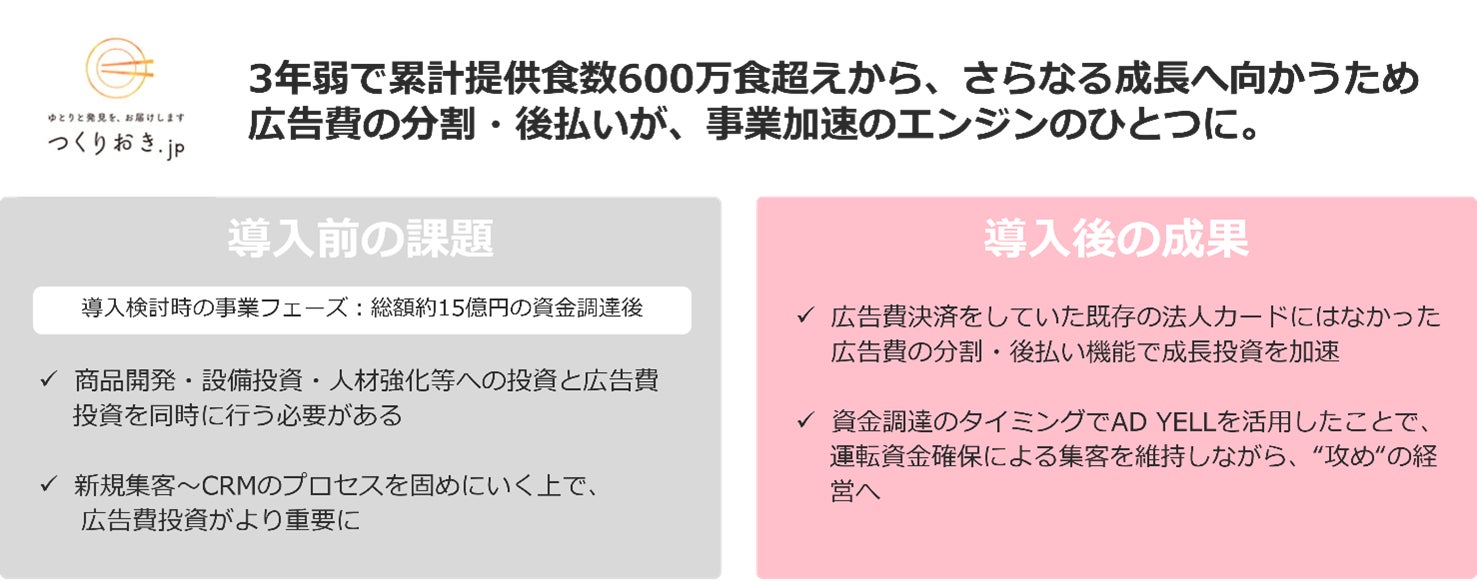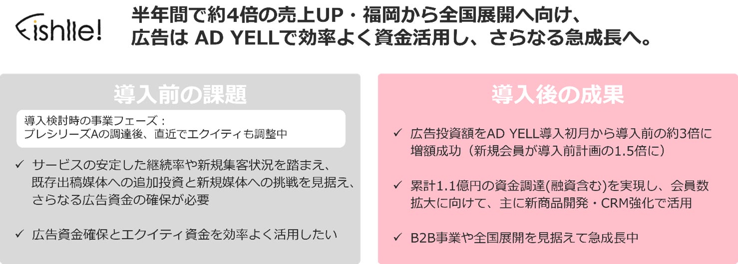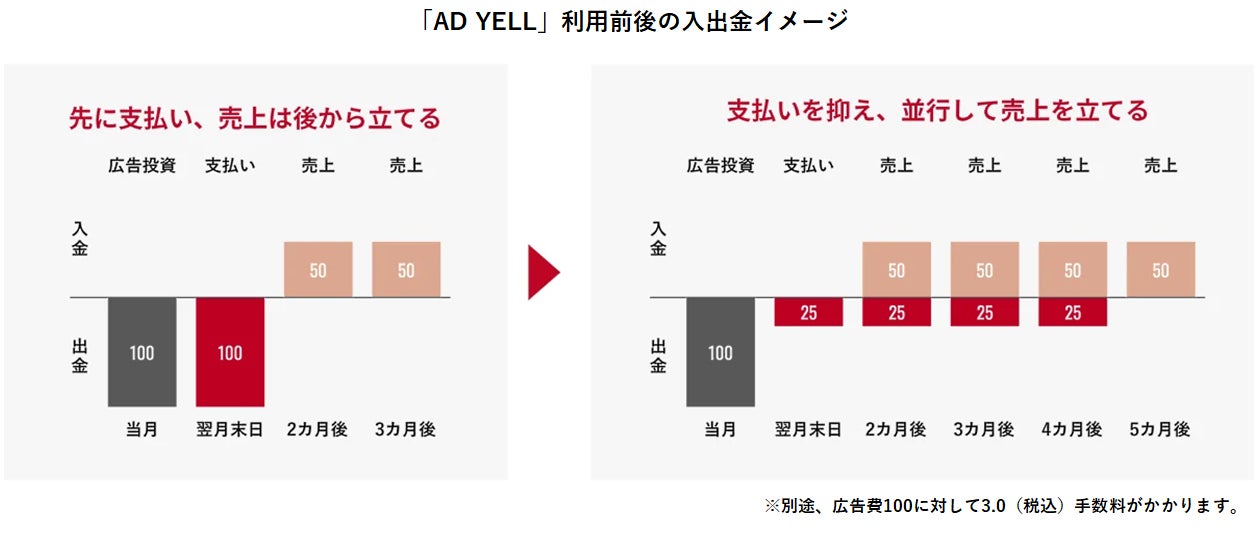 「AD YELL」は、事業成長へアクセルを踏み込むためには必要不可欠だが金融機関からは融資を受けにくい広告費を、事業者様が分割・後払い(BNPL)することを可能にすることで、「事業者様の資金繰りをスムーズにして成長曲線を上げる」ことをサポートしています。