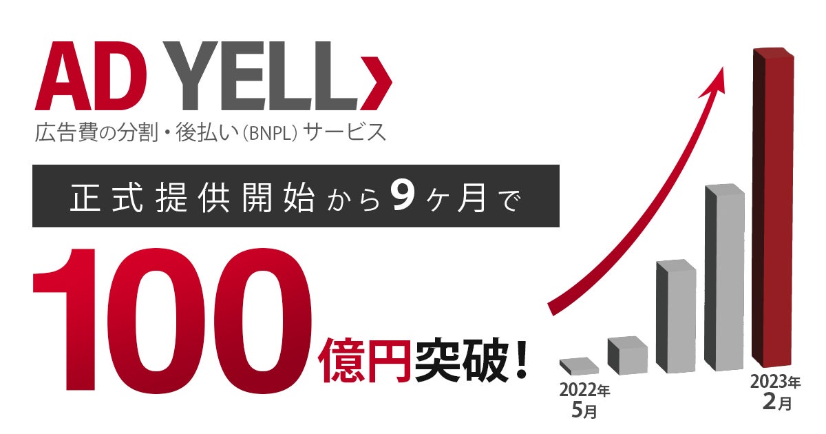 「新たな金融のカタチを創る」をミッションに掲げ、広告費分割・後払い(BNPL※1)サービス「AD YELL(アドエール)」を提供する株式会社バンカブル(本社:東京都千代田区、代表取締役社長:髙瀬 大輔、以下、バンカブル)は、「AD YELL」で取り扱う広告費の総額(以下、GMV※2)が、2022年5月の正式ローンチから9ヶ月で100億円を突破したことを、お知らせいたします。