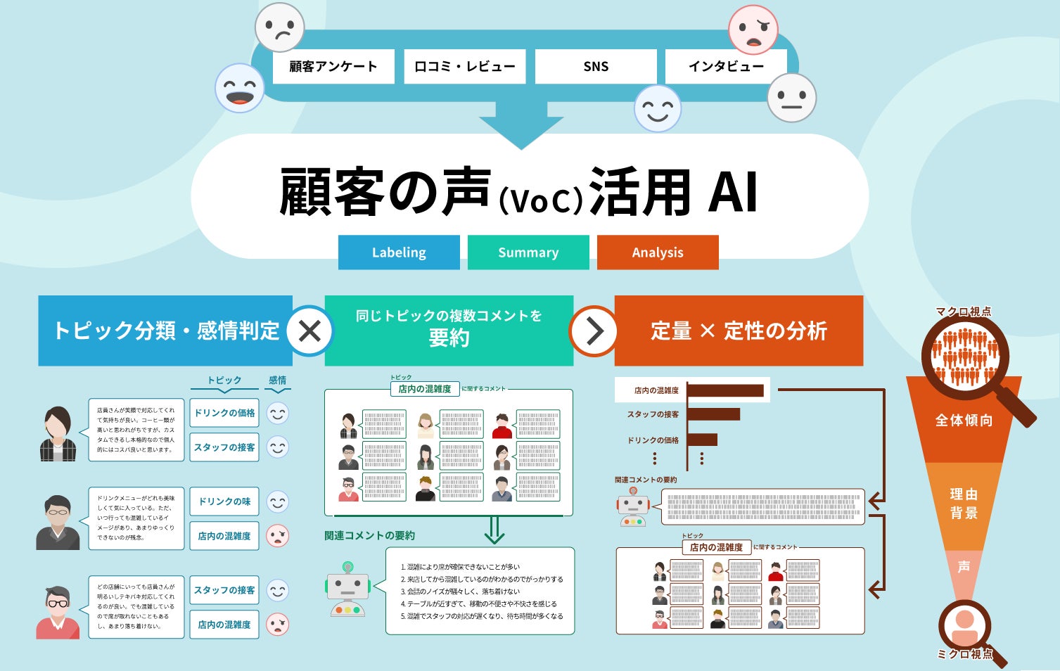 今回の新サービスでは、GPT-3をベースとする「VoC活用に特化したAI」が、あらゆるテキストデータを自動的に分類・要約・分析することで、人の手を介さずに、より深い顧客理解が可能になります。