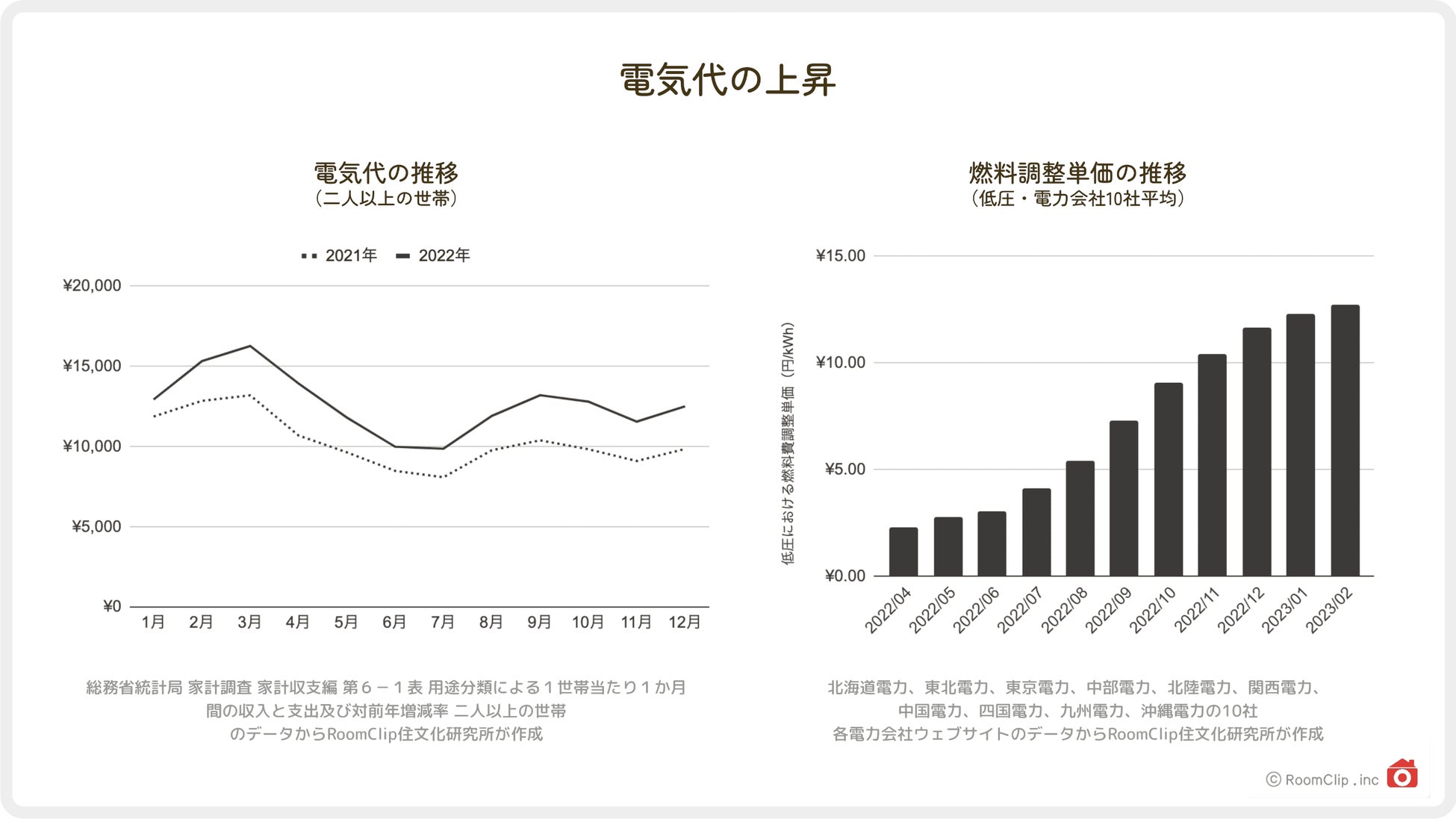 各電力会社のウェブサイトから得たデータを参照すると、2022年9月頃から燃料調整単価の上昇が目立ちはじめ、今も続いていることがわかります。このデータを年間の電気代推移に関するデータとつきあわせてみると、使用量のピークとなる冬場に電気料金が上がることは自明です。さらに、電力大手7社からは2023年4月以降、家庭向け電気の規制料金値上げが申請されており、生活者の不安をより大きくさせています。 これらのことを考えると、冒頭で紹介した「節電」のキーワード検索率を示すグラフからは、電気代が突然高騰した結果「何か手立てはないものか」と、RoomClip内でノウハウを必死に求めた姿が目に浮かびます。