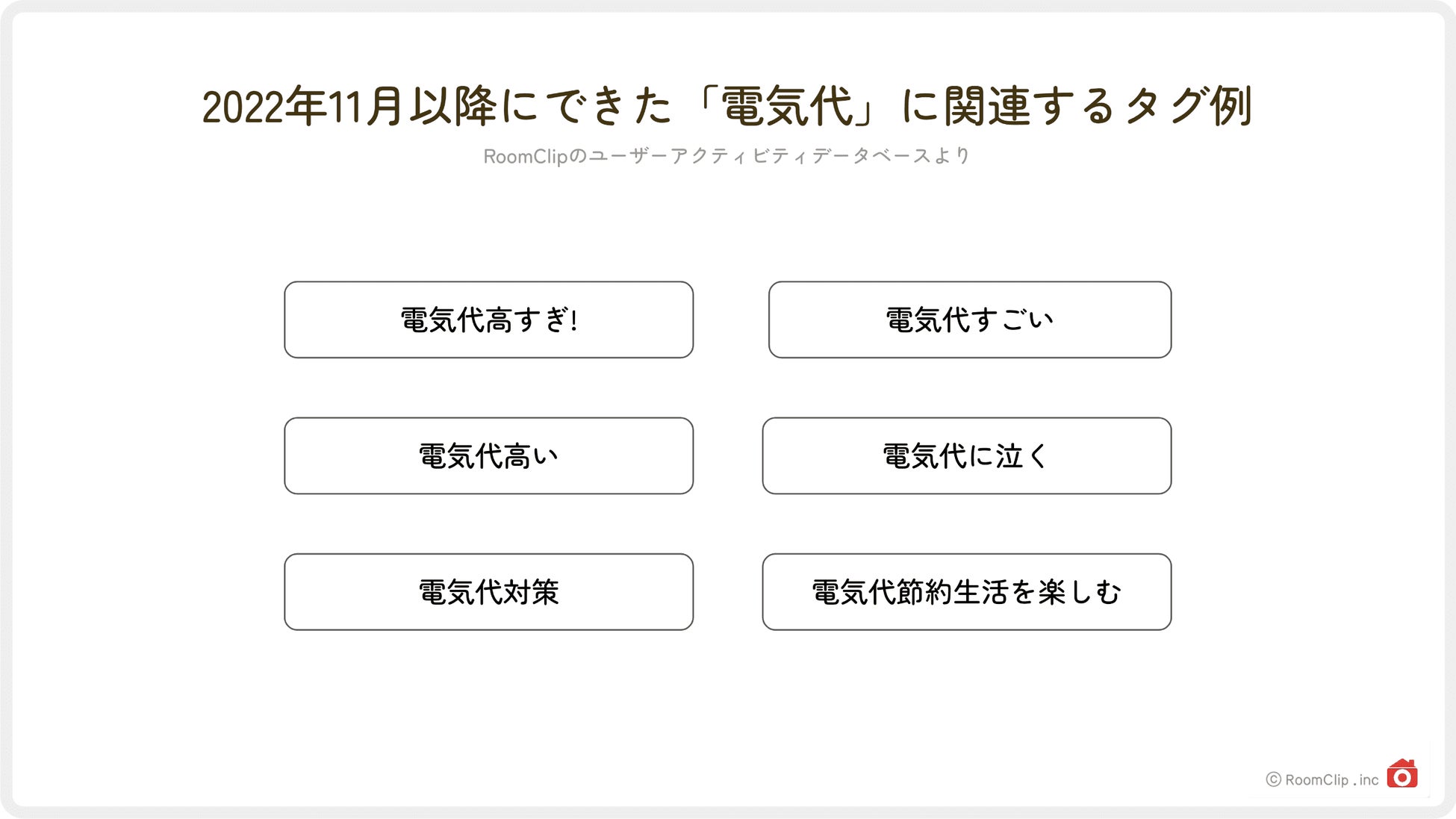 この結果と連動するように「電気代」というキーワードを含むタグの種類も、この3ヶ月で増えています。電気代高騰に対する素直な驚きや悲しみをそのままタグにしたものが目立ちますが、早いタイミングで現象への前向きな姿勢を示すものも生まれていました。