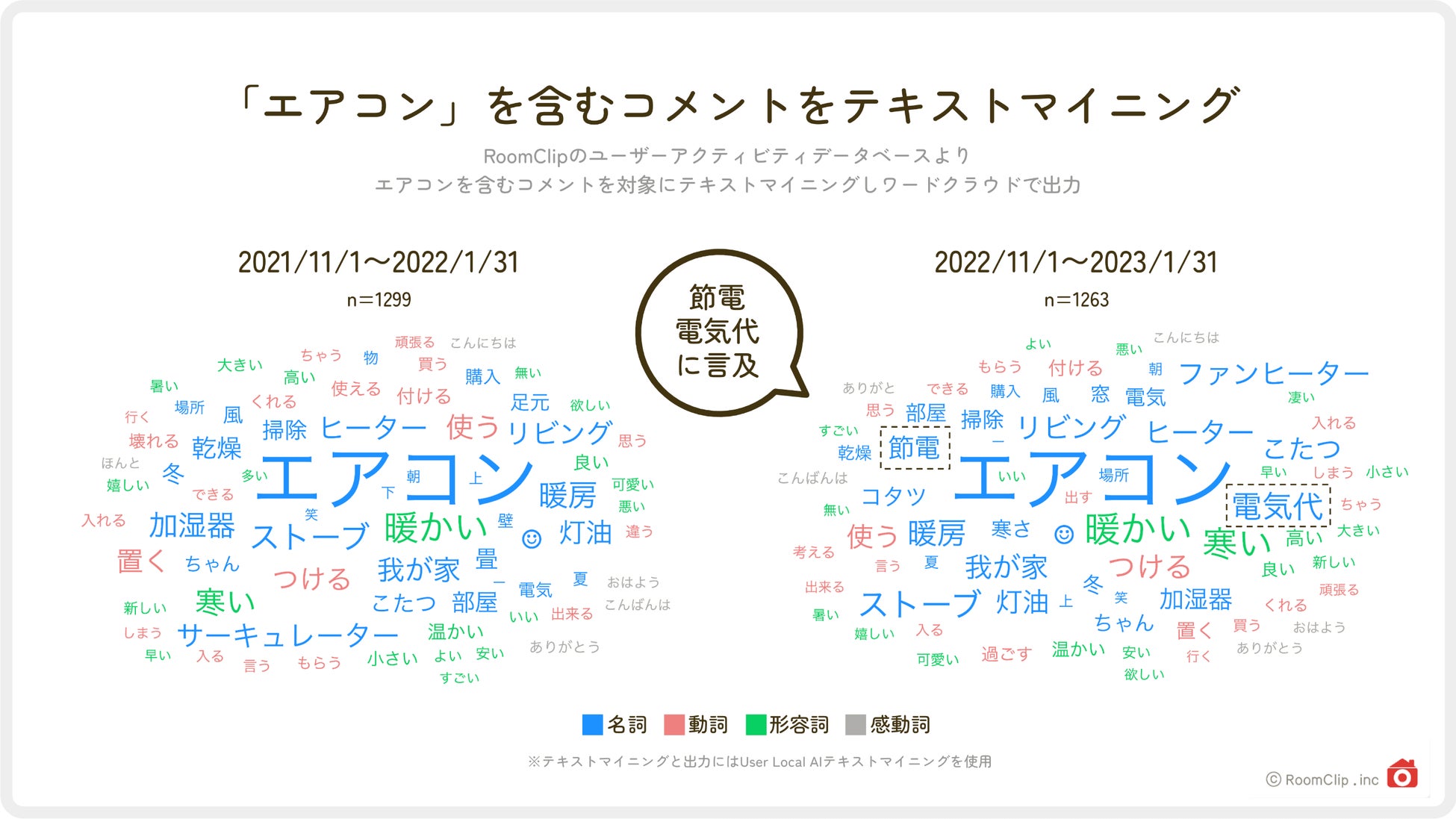 2021年11月から2022年1月までと、2022年11月から2023年1月までの期間に分けて「エアコン」を含むRoomClipの全コメントをテキストマイニングし、ワードクラウドで出力したものが上図です。大きめに表示されている文字と青色の文字に注目することで、「エアコン」にまつわる主な話題が見えてきます。 すると、2022年11月からの3ヶ月で、2021年には登場していなかった「電気代」というキーワードが目立つようになったのがわかります。