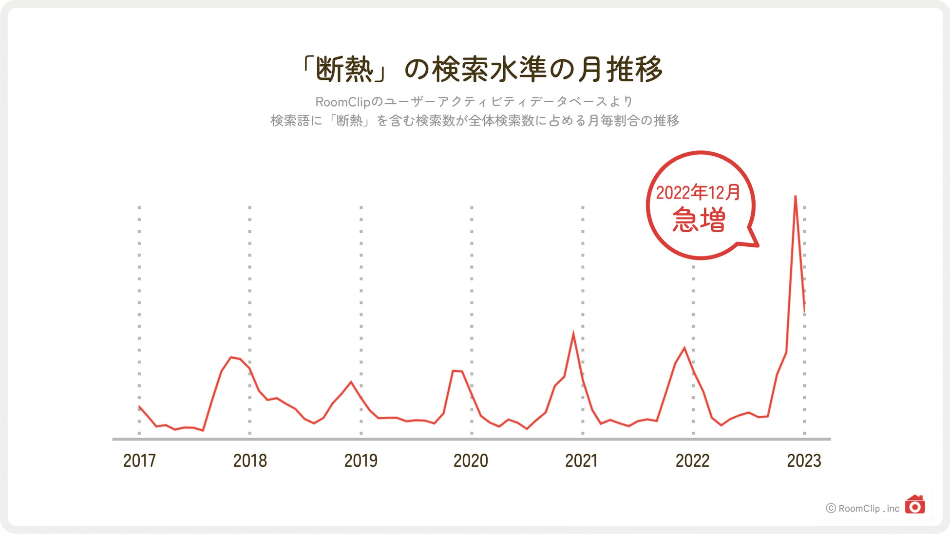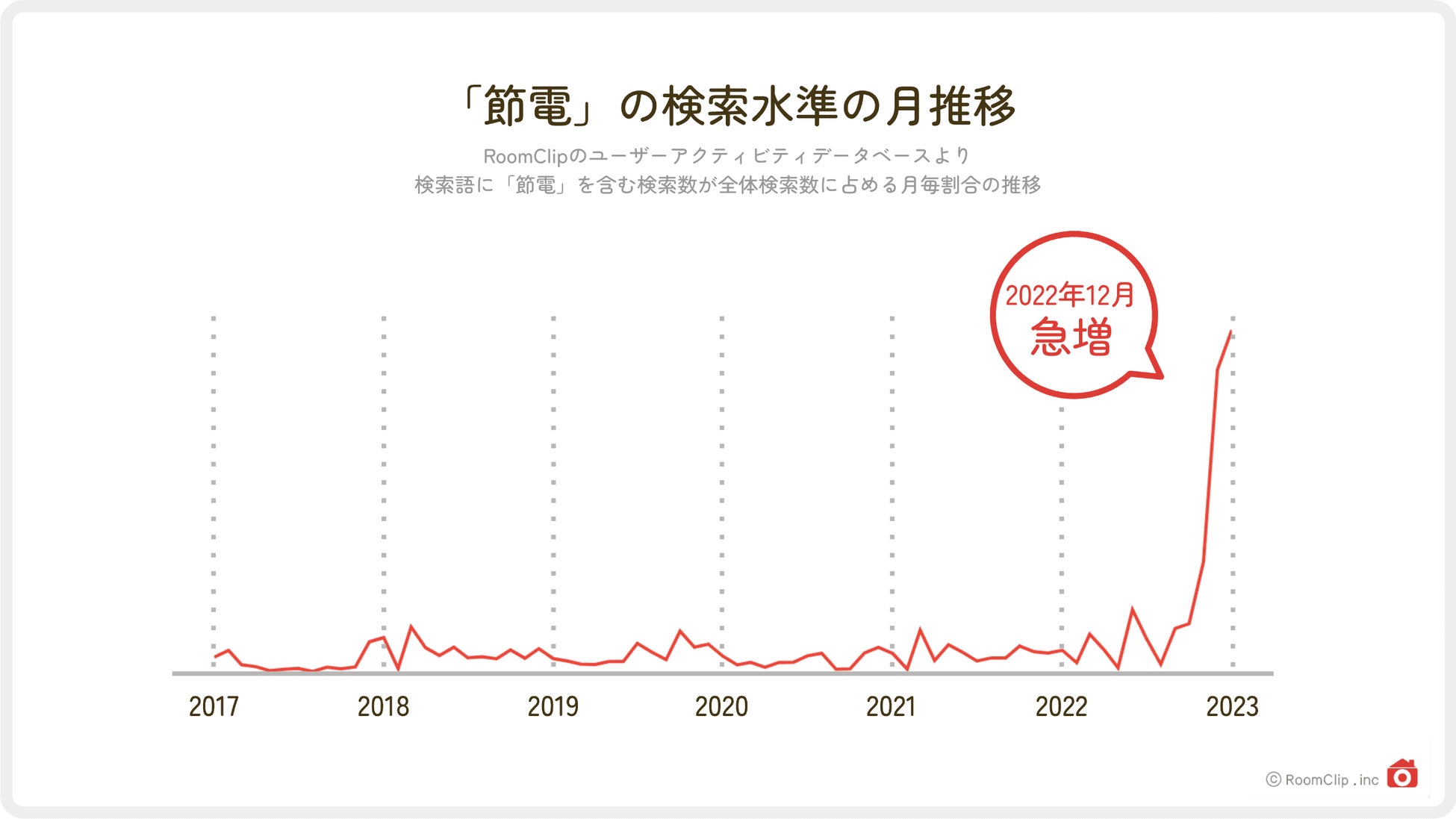 上図はRoomClipにおける「節電」というワードを含むキーワードの検索率の推移です。2022年12月に激増し、2023年1月にはさらに上昇。劇的な推移を見せています。