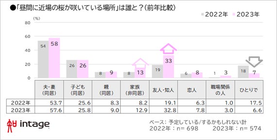 「昼間に近場の桜が咲いている場所」でのお花見を一緒にする人については、「同居の夫・妻」が約6割と最も多く、次いで「友人・知人」が約3割となっていました。「友人・知人」は昨年と比較して13.7ptも増えていました。その一方で、「ひとりで」は6.6%と昨年と比較して-10.9ptとなり大きく減少していました(図表3)。先ほどのお花見実施予定の結果を踏まえると、今年は「おひとり」ではなく、家族(夫・妻・子ども)とはもちろんのこと、友人・知人ともお花見を楽しみたい、と考えている人が多いことが浮かび上がりました。