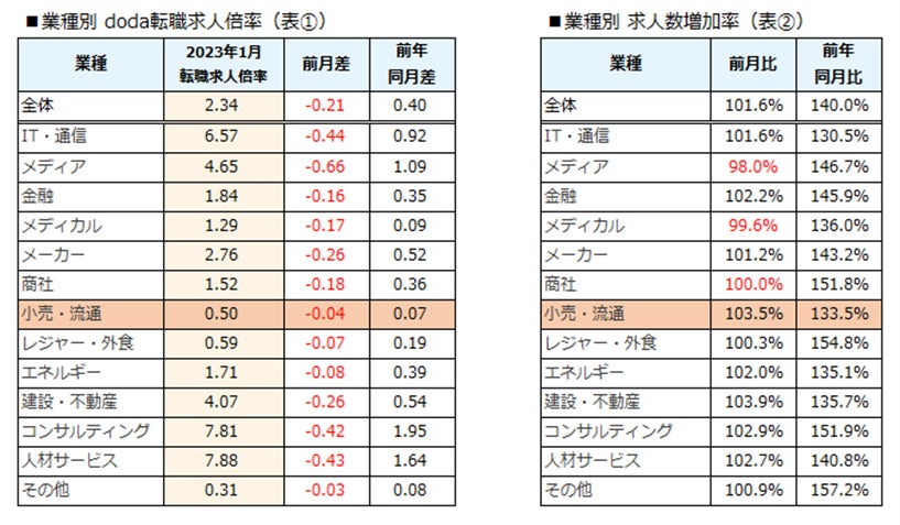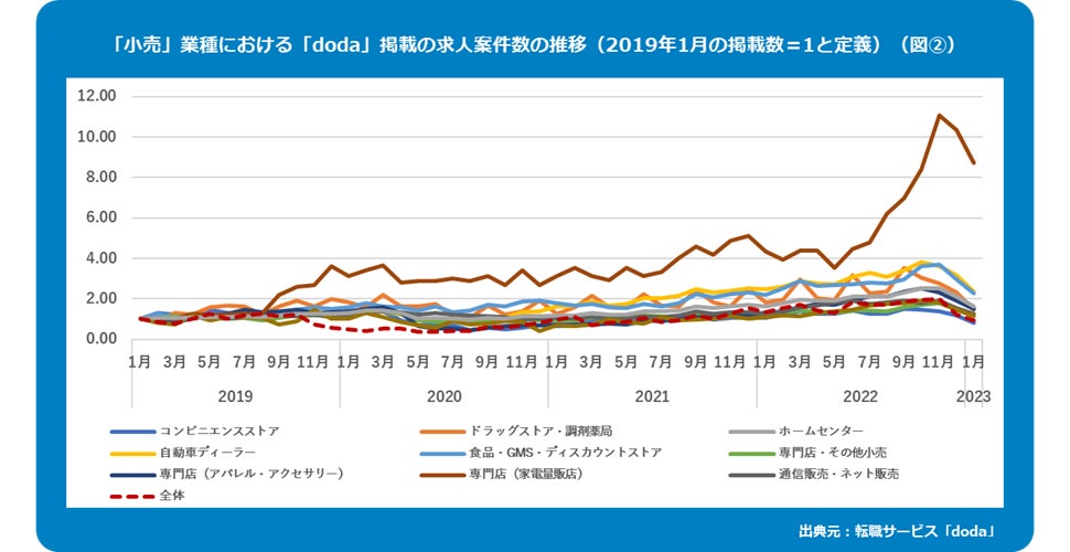パーソルキャリア株式会社が運営する、転職サービス「doda(デューダ)」は、2023年1月の小売・流通業界の転職求人倍率をまとめた「業界版doda転職求人倍率」を発表いたします。なお、本業界の最新動向は、doda編集長 大浦 征也が解説します。
