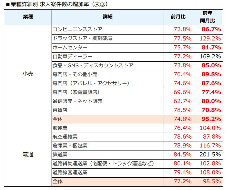 求人案件数は、小売・流通ともにほぼすべての業種で前年同月比が大きく減少。