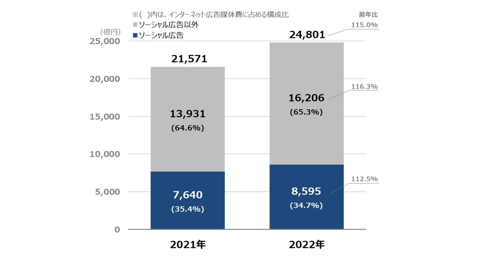 ソーシャルメディアのサービス上で展開されるソーシャル広告は前年比112.5%の8,595億円で、インターネット広告媒体費全体の34.7%となった。ソーシャル広告以外が前年比116.3%と伸長したためソーシャル広告の構成比は微減となった。【グラフ6】