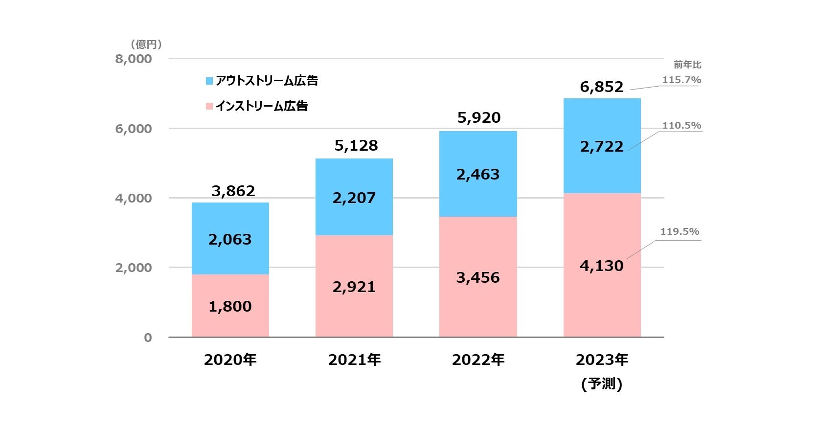 2023年のビデオ(動画)広告は前年比115.7%と引き続き高い成長率を維持し、6,852億円まで増加すると予測する。その中でもインストリーム広告は前年比119.5%の成長を見込む。【グラフ9】