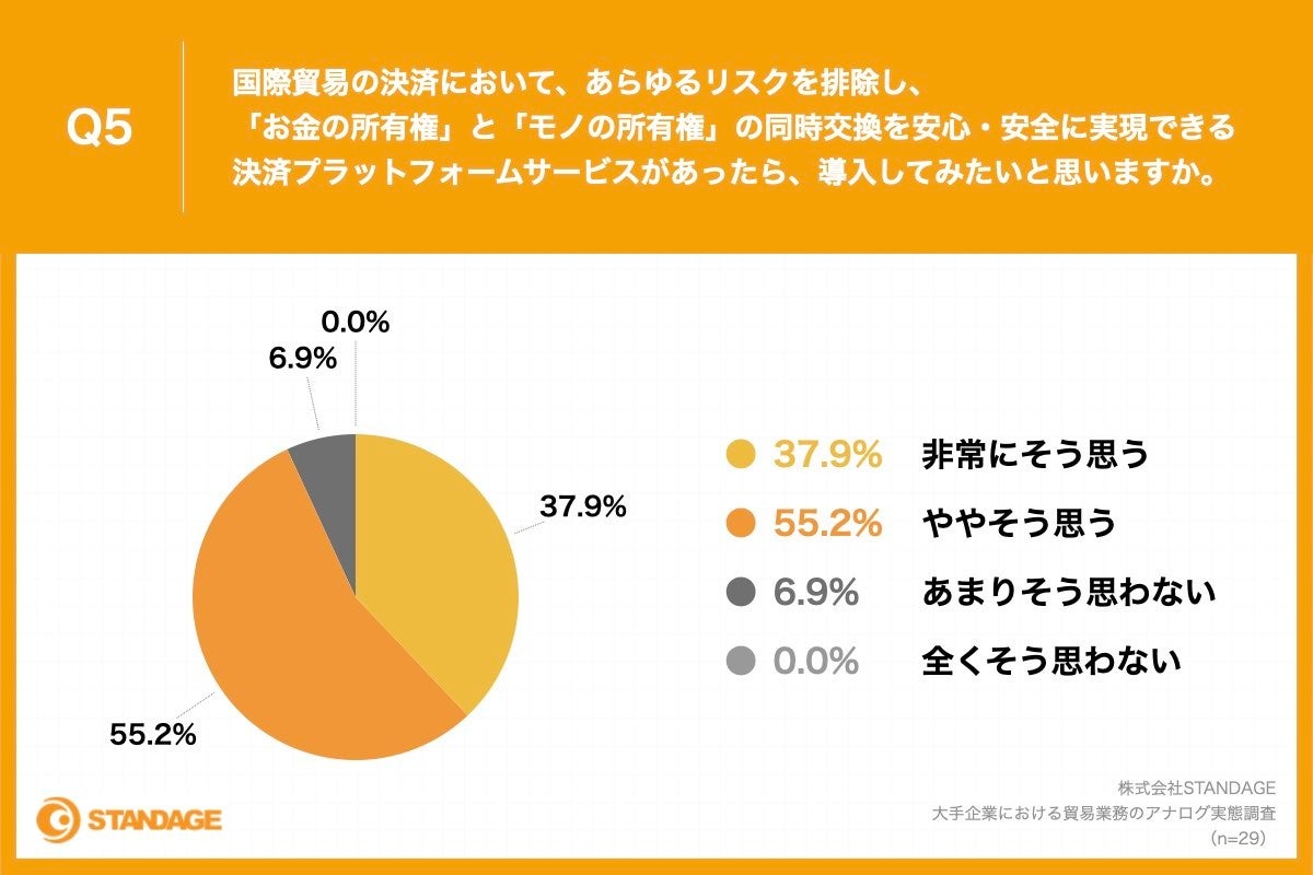 Q3で「代金不払いや回収、為替予約、外貨規制など、決済面にリスクを感じている」と回答した方に、「Q5.国際貿易の決済において、あらゆるリスクを排除し、「お金の所有権」と「モノの所有権」の同時交換を安心・安全に実現できる決済プラットフォームサービスがあったら、導入してみたいと思いますか。」(n=29)と質問したところ、「非常にそう思う」が37.9%、「ややそう思う」が55.2%という回答となりました。