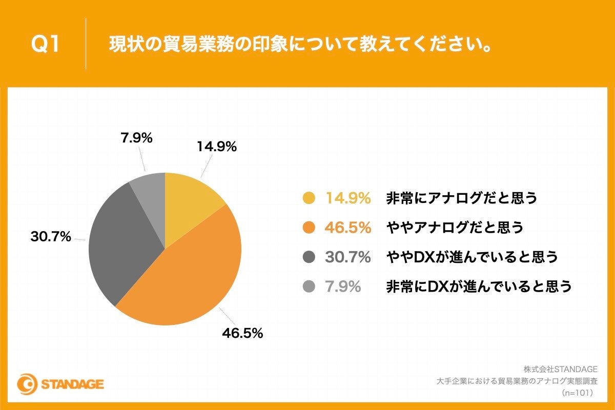 「Q1.現状の貿易業務の印象について教えてください。」(n=101)と質問したところ、「非常にアナログだと思う」が14.9%、「ややアナログだと思う」が46.5%という回答となりました。