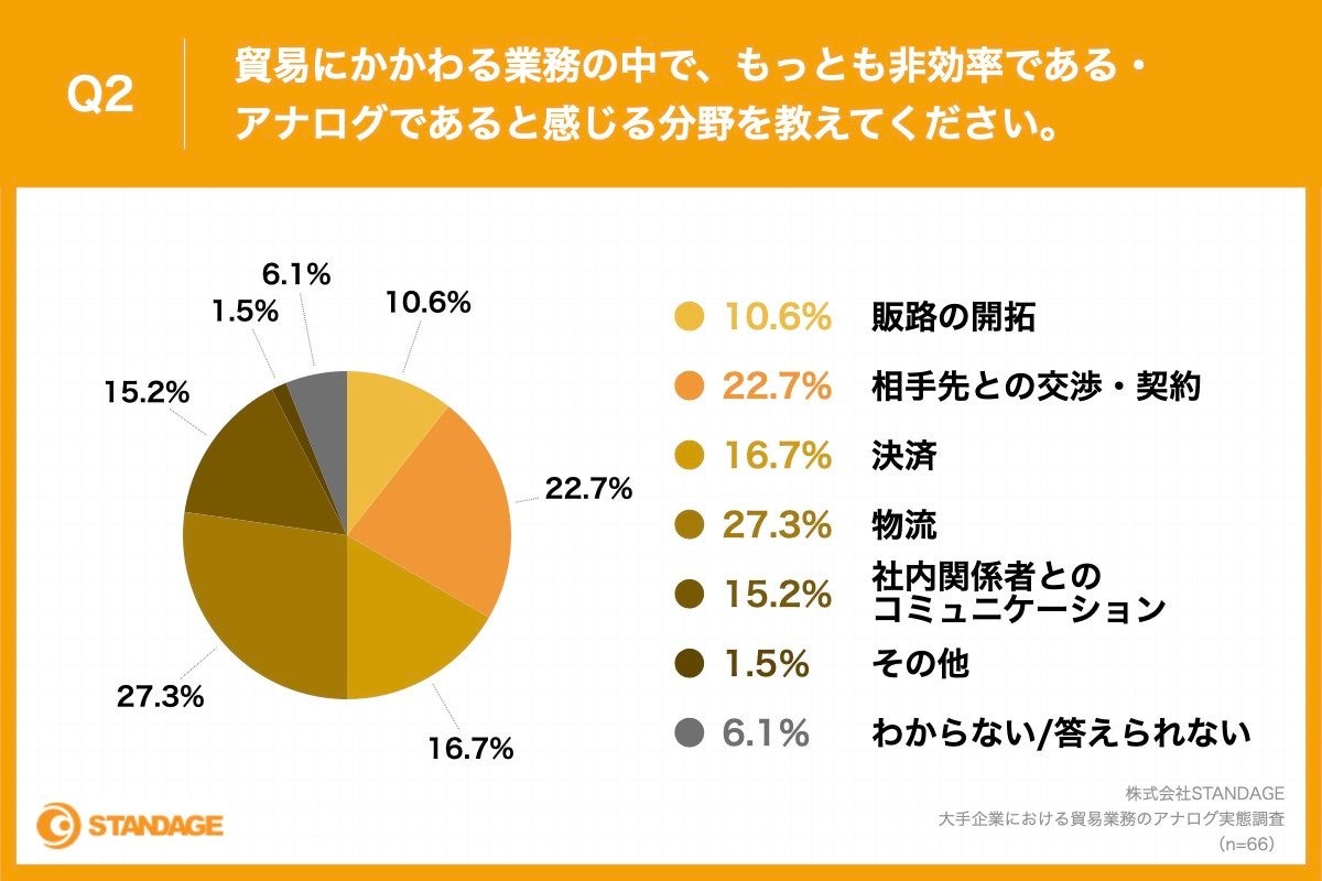 Q1で「非常にアナログだと思う」「ややアナログだと思う」と回答した方に、「Q2.貿易にかかわる業務の中で、もっとも非効率である・アナログであると感じる分野を教えてください。」(n=66)と質問したところ、「相手先との交渉・契約」が22.7%、「物流」が27.3%という回答となりました。